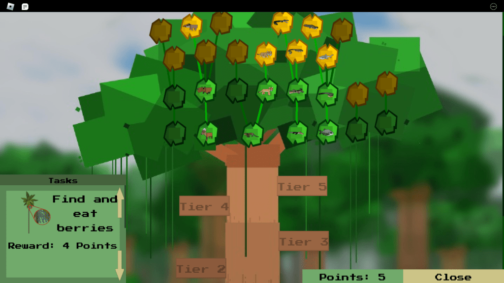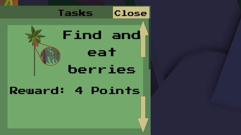 The points you gain for each one are fair and vary a good amount, some are tedious but they are mostly fun and give you an aim while playing, which generally keeps me interested for longer than other animal survival games. I would rate Tasks a 9/10 because they can get a tiny bit tedious as herbivores.