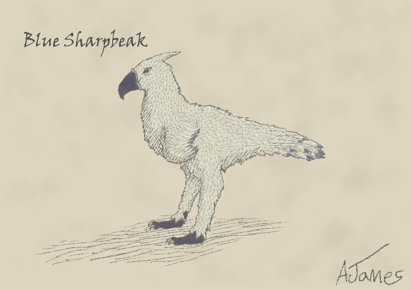 It’s a mostly solitary animal, being territorial against other Sharpbeaks. To this end, dark blue feathers decorate its plumage for intimidation, and during the Summer for courtship displays.
